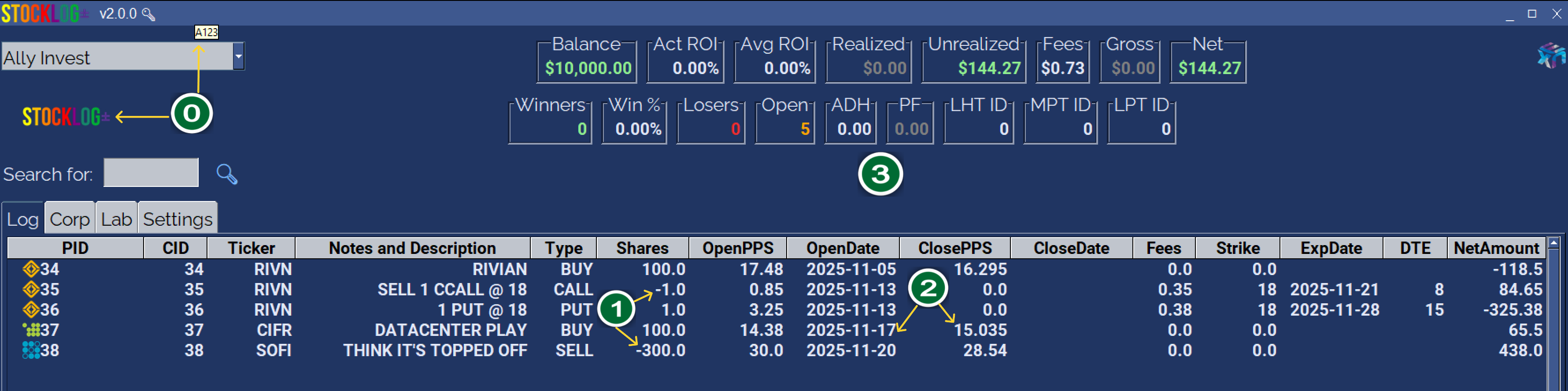 3: Because of #2, Stocklog+ is able to summarize Unrealized gains & losses and current Net. Notice 5 OPEN trades because no trade has a ClosedDate to actually close the trade