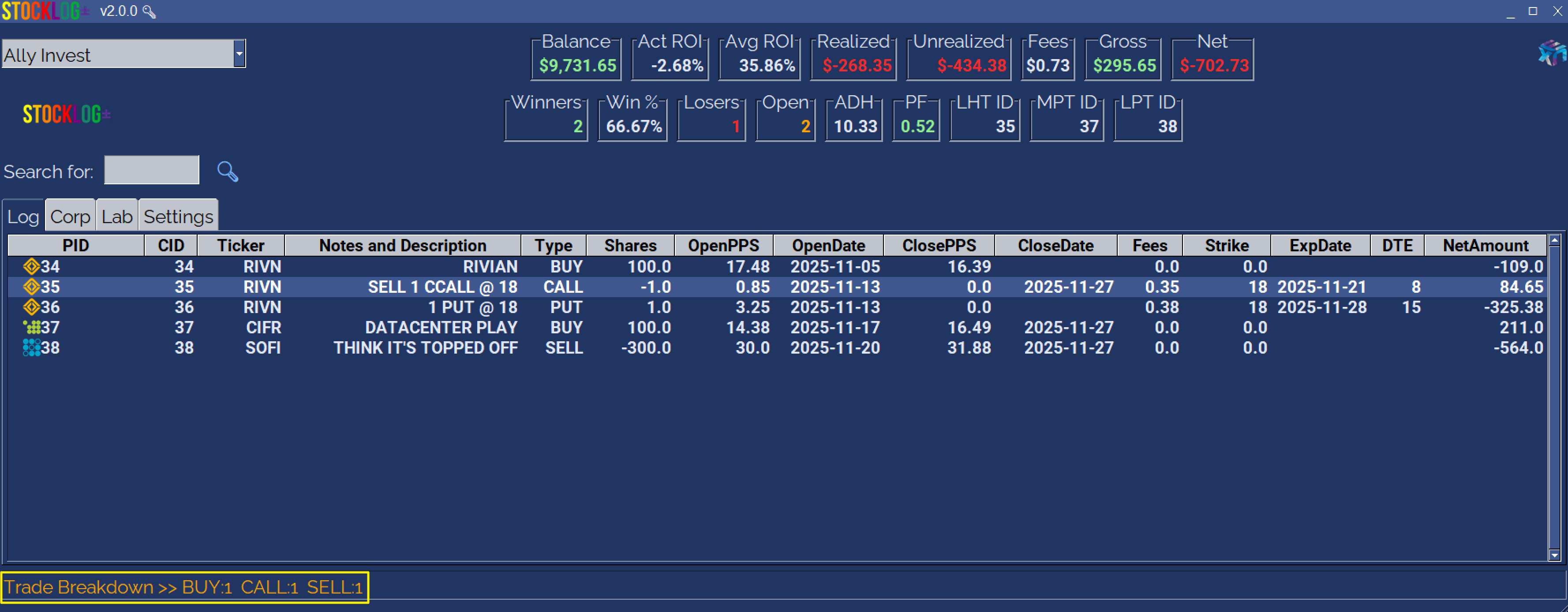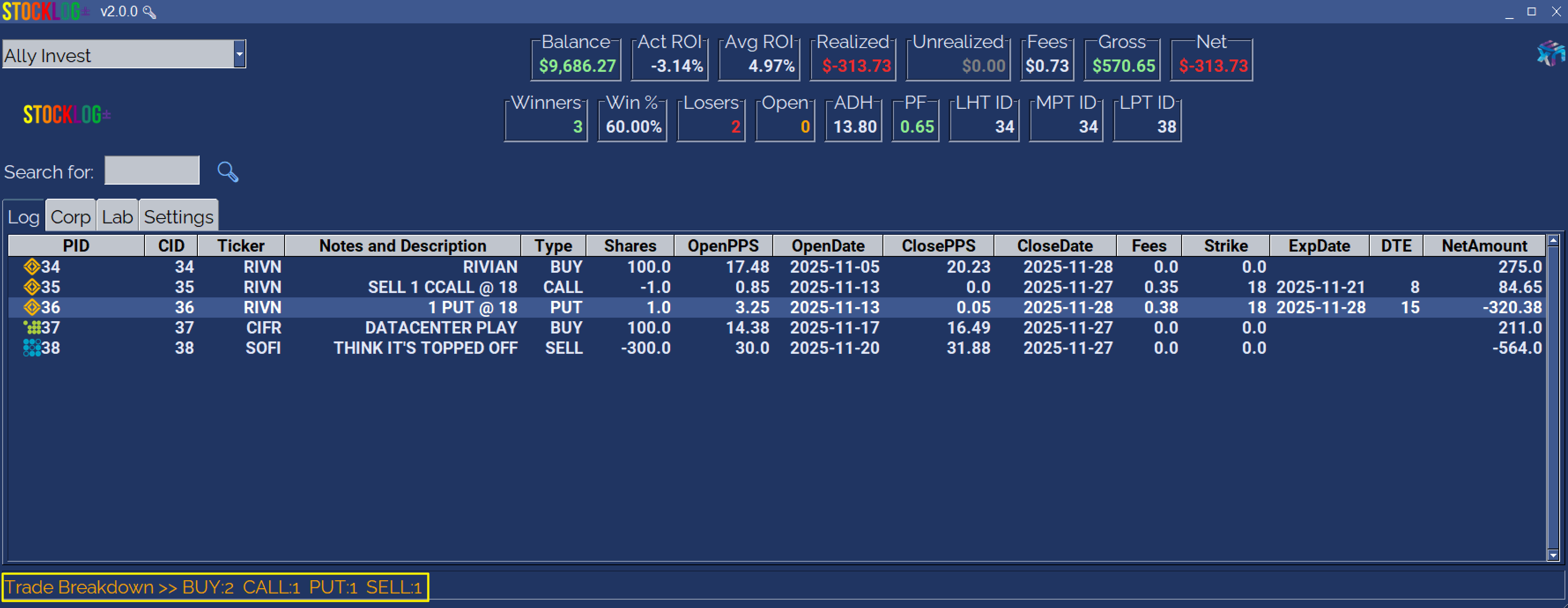 - Trade Breakdown let's us know we have closed: 2 BUY Trades, 1 Call, 1 Put, and 1 Sell. Good information when you have tens, hundreds, or thousands of trades! It gives another data point.