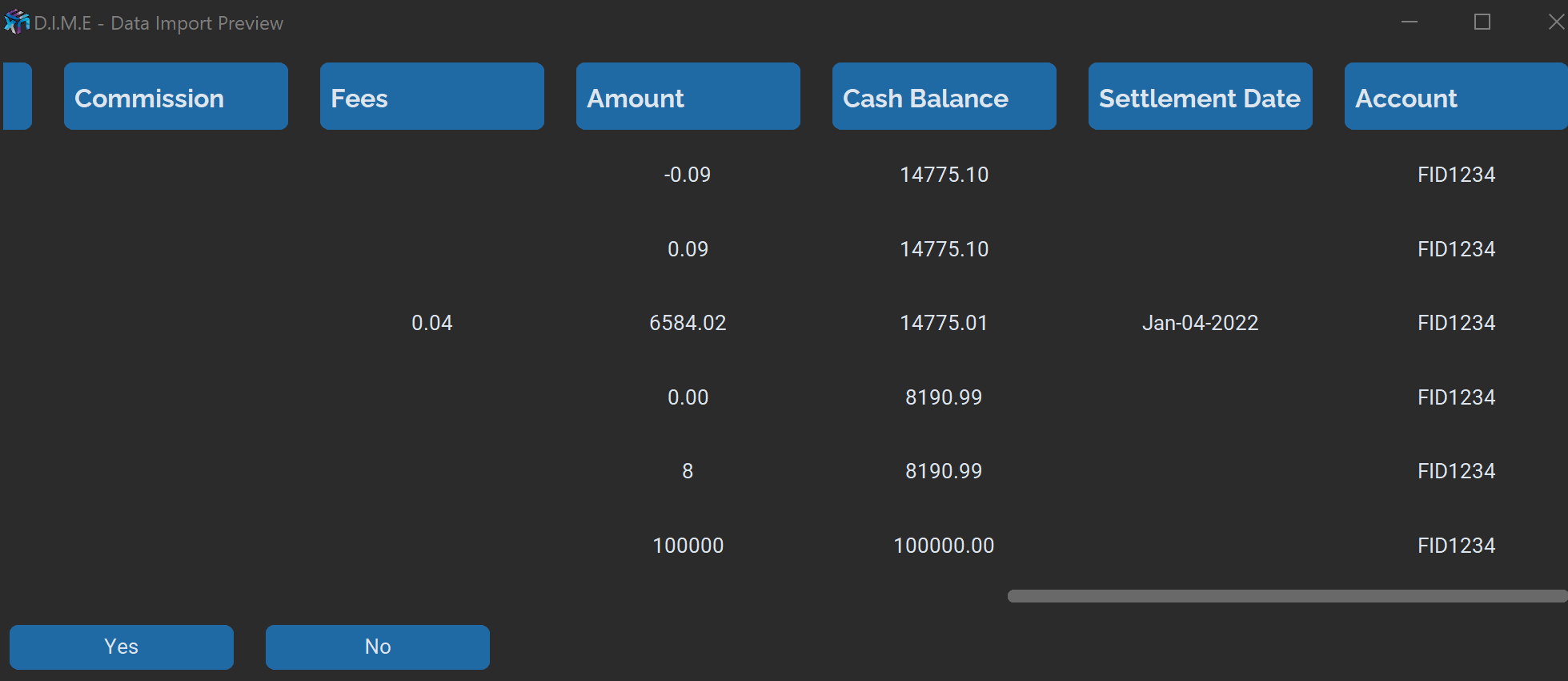 Once you've selected the columns, you will be presented with a final preview of what will be imported, along with the account number at the end. Click on yes to proceed or no to cancel.